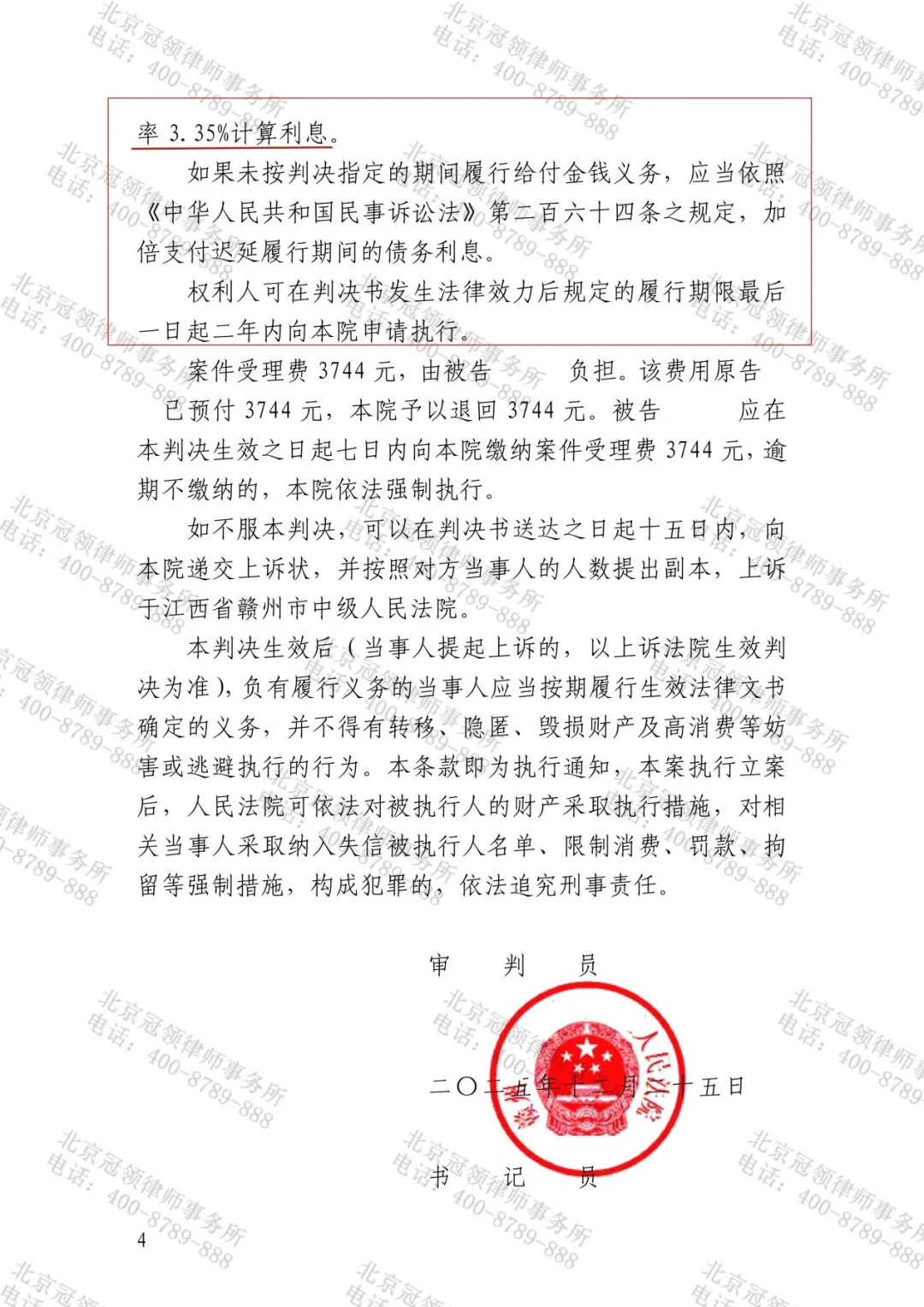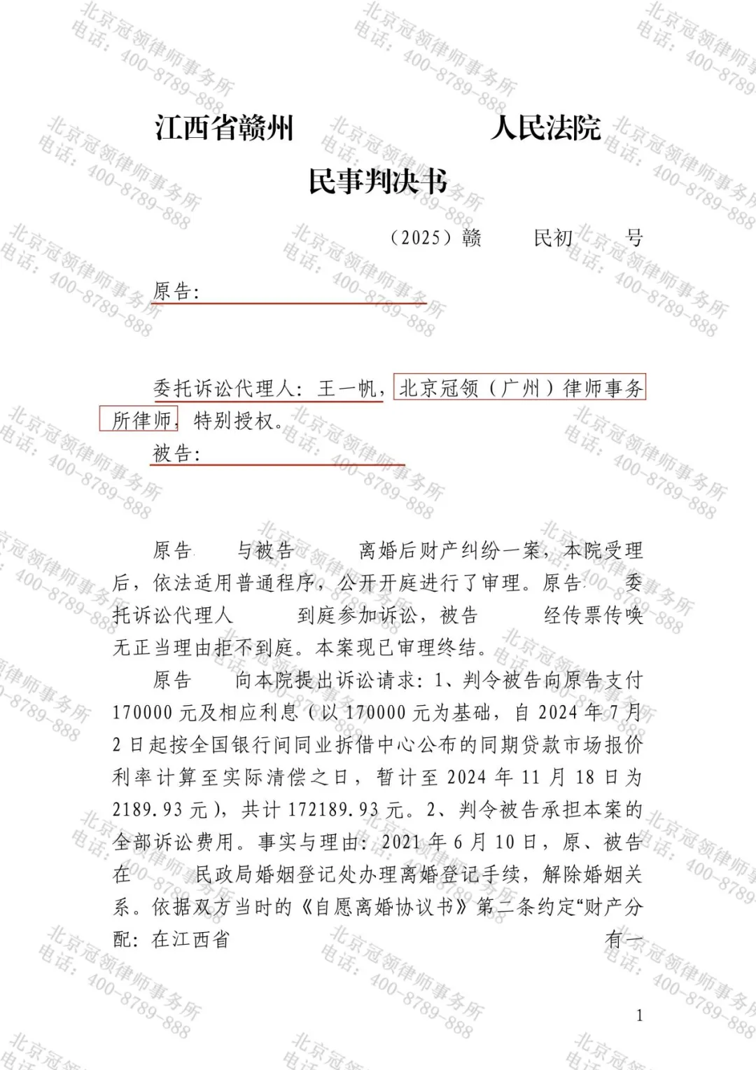 法院经审理,完全采纳冠领律师的代理意见。判决书指出:离婚协议系双方真实意思表示,合法有效;陈振兴仅支付3万元构成严重违约;宋小兰选择要求支付剩余17万元及利息符合约定。2025年12月25日,法院判决陈振兴七日内支付17万元本金,并自2024年7月1日起按年利率3.35%计算利息。