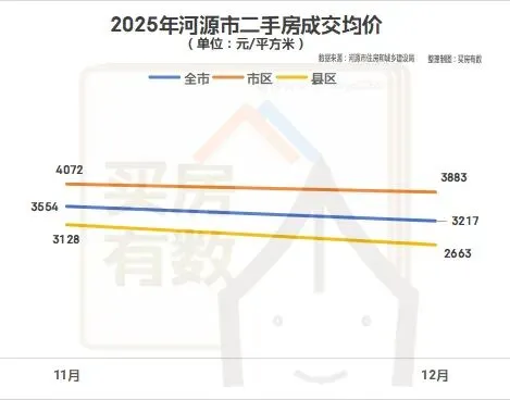 2025年12月份,河源市全市二手房成交均价约3217元/平方米,环比下降9.48%,其中市区成交均价约3883元/平方米,环比下降4.64%;县区成交均价约2663元/平方米,环比下降14.88%。