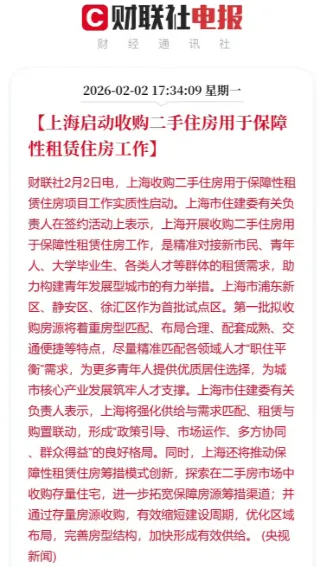 2月2日,上海第一批收购二手住房用于保障性租赁住房项目启动。