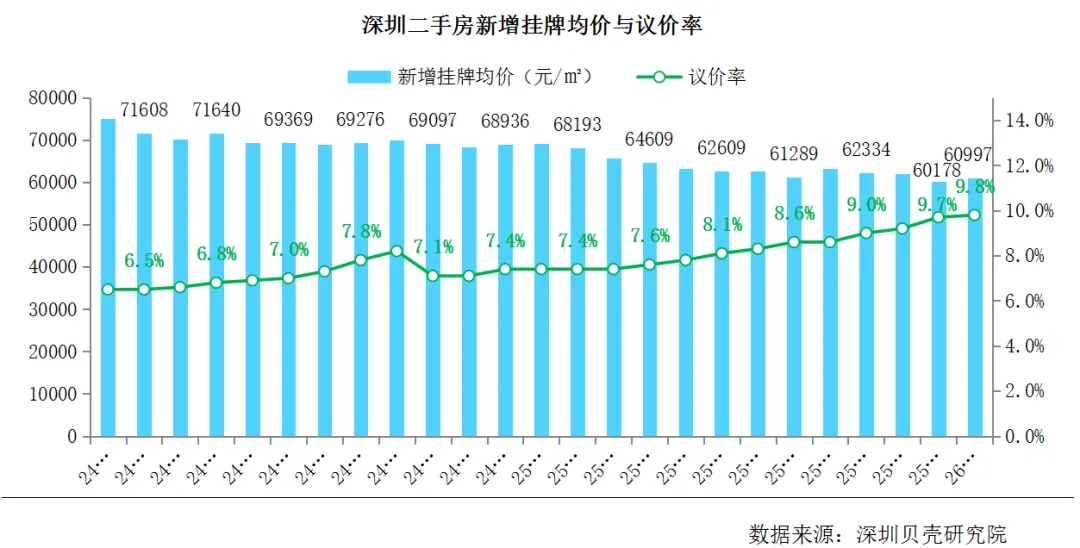深圳贝壳研究院统计,1月新增挂牌均价为60997元/㎡,没有继续下滑,整体稳定在了6万/㎡的均价。