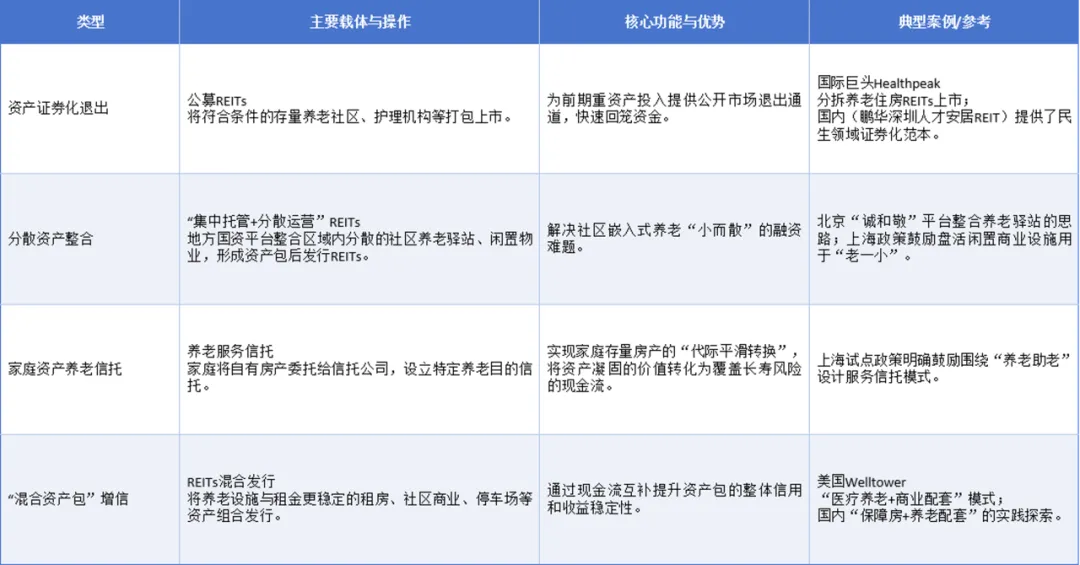 依托上述政策框架,不动产信托与公募REITs可以组合演化出多层次、可复制的盘活模式,满足从机构到家庭的不同需求。