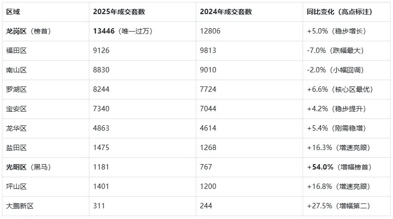 各区二手房成交分化显著,以下是2025年与2024年深圳各区二手房成交套数对比表,清晰呈现各区走势:
