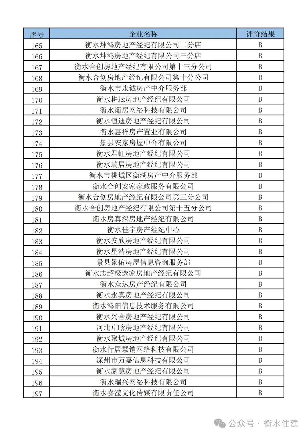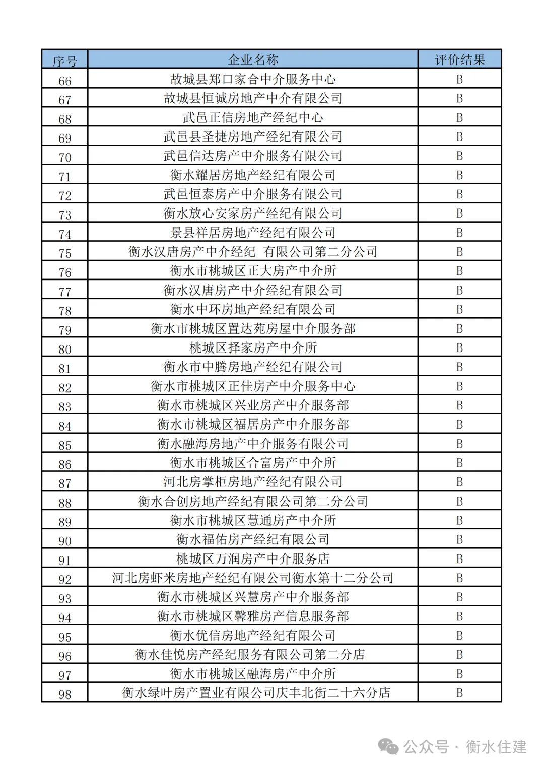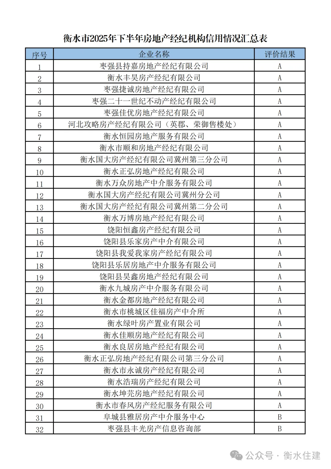 为进一步加强房地产经纪行业管理,规范房地产经纪机构市场经营行为,促进房产交易市场健康发展,近期,市住建局依据《衡水市房地产经纪机构信用信息管理办法》相关规定,对全市2025年下半年房地产经纪机构信用情况完成等级评定。