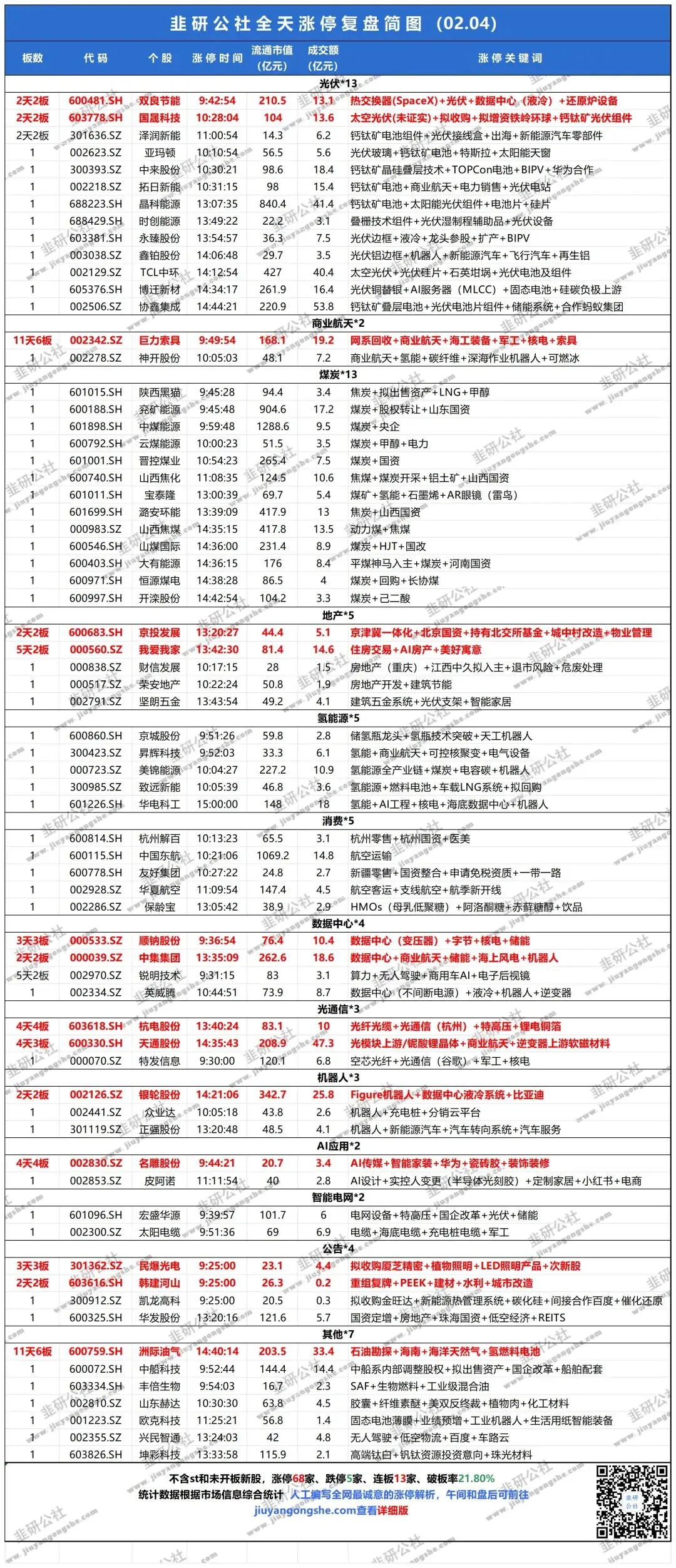2.4周三:光伏13/煤炭13/地产6/氢能源5/大消费5/电力电网/机器人/算力/商业航天等