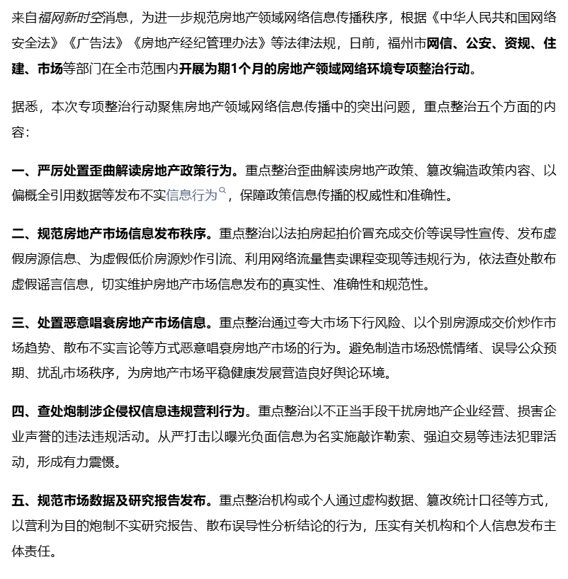 2月3日,也就是福州贝壳平台隐藏二手房成交价当天,福州市网信、公安、资规、住建、市场等多部门联合发布消息,在全市范围内开展为期1个月的房地产领域网络环境专项整治行动。此次专项整治行动,依据《中华人民共和国网络安全法》《广告法》《房地产经纪管理办法》等法律法规开展,旨在规范房地产领域网络信息传播秩序。