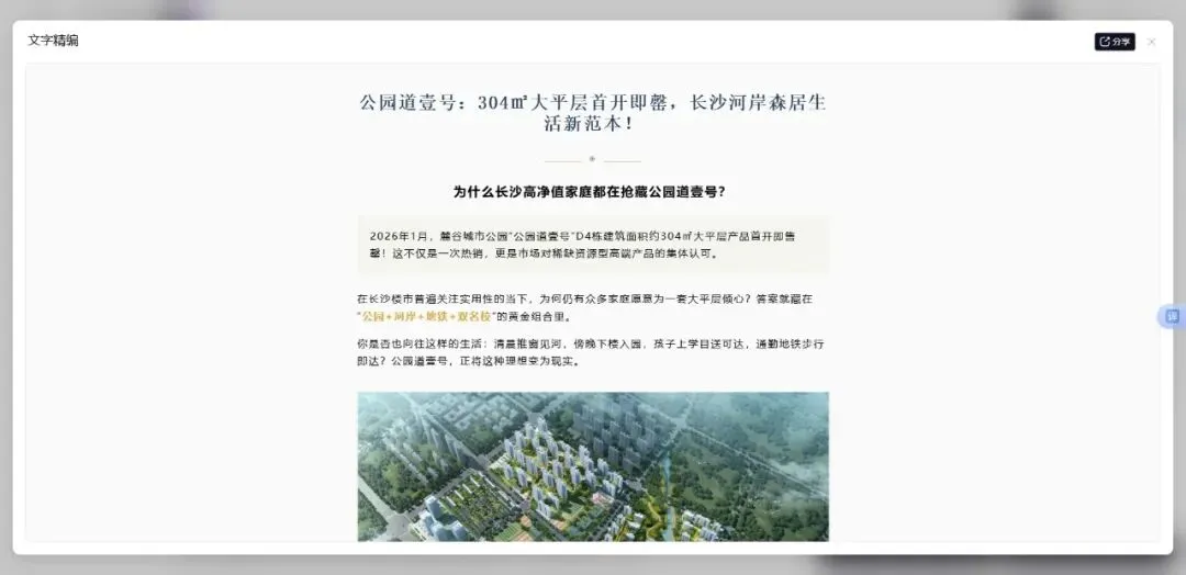 克而瑞·深度智联是地产人的“第二大脑”,房地产行业的首个AI AGENT。它不仅会思考分析,还会提供工作成果,擅长处理您工作中各种场景的任务,可以帮您完成多个复杂工作,是您最佳的AI助手。 为什么公园道壹号是“2026长沙品质期待楼盘”