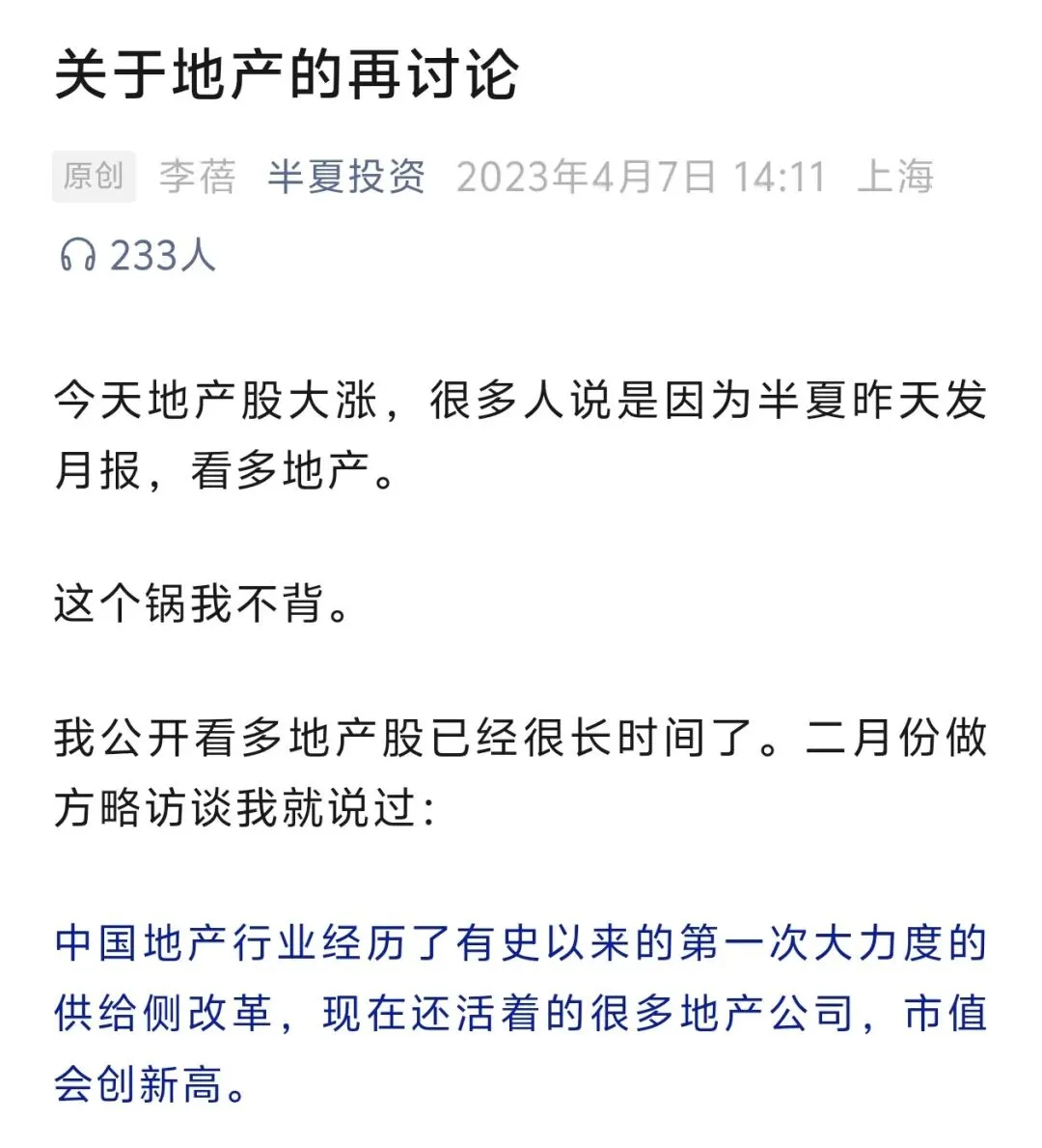 那天地产股也是大涨,她第一时间发文《关于地产的再讨论》。
