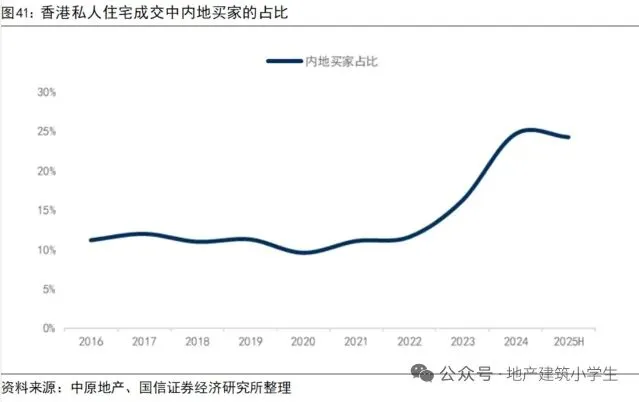 2024年和2025上半年香港私人住宅成交中,内地买家购买占比分别为25%、24%,远远高于2021-2023年的占比。