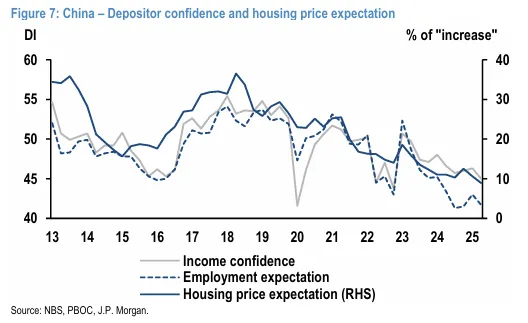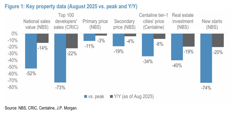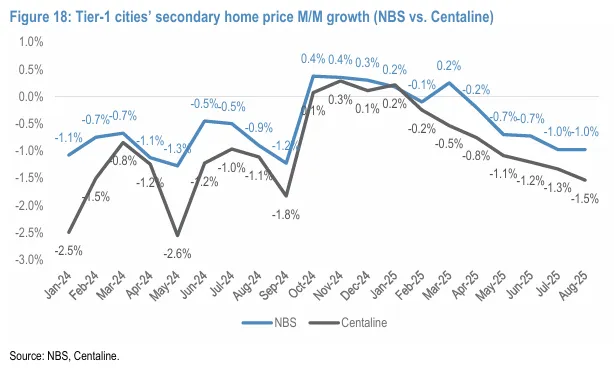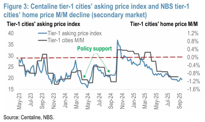 译文:上一次政策刺激的影响已经完全消退:自2024年9月政策刺激以来,住房市场最初经历了5-6个月的稳定。然而自2025年4月起,所有关键指标又转向萎靡。销售状况持续萎靡:房地产销售目前较高峰期下降52%(统计局)/73%(CRIC)。按年同比计算,即使在非常低的基数上8月份销售仍下降14%(统计局)/22%(CRIC)。去年第四季度的基数将显著上升,如果没有进一步的政策支持,同比下降幅度势必会扩大。图 1:房地产主要数据(2025年8月 vs 高峰期,以及同比)分析:新房销量的下跌仍在继续,这里我们主要看CRIC数据,即100个头部开发商的新房销量跌幅,目前CRIC销量已经跌至峰值的27%,也就是说跌掉了将近四分之三,对于这个跌幅要分成两个阶段来看:第一阶段是2021年的销售峰值时期透支了未来1到2年内的购房需求,所以2022-2023年的销量下跌可以认为是正常的缩量调整阶段。第二阶段是经过了两年的恢复期后,2024-2025的销量下跌属于购买力积聚的阶段,这两年的购房需求是增加的,但房价跌势并没有企稳的迹象,所以大家买涨不买跌都憋着不急于出手。从月同比的角度来看,在去年8月销量数据非常低的情况下CRIC仍然下跌了22%,这说明市场情绪已经到了冰点。去年四季度由于924的刺激销量基数是大幅上涨的,所以今年四季度如果没有足够强的刺激出来的话同比数据会很难看,这也是市场对四季度有政策预期的主要原因。译文:价格下跌正在加剧:根据中原房产的数据,一线城市的二手房价格目前比峰值低34%,截至8月同比下降8%。领先指标(中原一线城市的挂牌价格指数)也从峰值的36降至最近的20(尽管一线城市最近经历了一轮楼市政策宽松)。有趣的是根据国家统计局的数据,7月和8月一线城市的二手房价格平均环比下降0.9-1.0%(较2025年第一季度的稳定趋势有所走弱),甚至比二三线城市的平均环比下降0.5-0.7%还要跌幅更大。由于一线城市在全国市场情绪中具有领先地位,我们认为一线城市的趋势是值得关注的关键。图 3:中原一线城市挂牌价格指数与统计局一线城市二手房环比价格下降分析:根据中原房产数据,一线城市二手房价格较峰值下跌了34%,今年8月价格同比下跌了8%,中原数据还是比较符合大家体感的,说明迄今为止一线城市的二手房价格仍然处于明显的下跌通道中。中原一线城市挂牌价格指数从峰值的36跌至20也佐证了这一点,下跌幅度高达44.45%。有意思的是,今年7月和8月一线城市的二手房价格下跌幅度达-0.9%到-1.0%,大于二三线城市的-0.5%到-0.7%。由于一线城市的二手房走势向来领先于二三线城市,所以可以合理预期四季度二三线城市的二手房下跌速度很可能也会加快,这也是评论区有人问我啥时候买我一般都会统一回复年后再看的原因,自924以来的判断还是很准确的。译文:我们认为高层对政策支持的立场是依赖于数据的,因此只有数据恶化才可能促使更强有力的政策支持。与2024年4月/8月相比:虽然尚不清楚高层的“痛点”究竟在哪里,但我们尝试通过观察房价、销售、房地产投资(REI)最新趋势,与2024年4月和2024年8月进行比较(即去年政策刺激前的一个月,包括2024年5月的“去库存”和2024年9月提出的“止跌回稳”呼吁)。价格和房地产投资已经“够糟了”:从表1得出的结论是,如果政府主要关注一线城市的房价走势(这是中国其他地区的领先指标)以及房地产投资(固定资产投资的主要贡献者),那么最新的数据已经“和2024年4月/8月一样糟糕”甚至“更糟”。表 1:数据比较:2025年8月 vs 2024年4月/8月(政策刺激前一个月)分析:小摩认为高层是否推出房地产刺激政策取决于数据,只有当数据变得足够差时才会出政策来托底,那么搞清楚数据差到什么程度会导致托底政策出台就比较重要了(即痛苦阈值)。这里选取了去年的两个出台国家层面房地产刺激的时间点作为锚点,这两个时间点分别是去年5月触发的去库存和去年8月触发的呼吁止跌回稳。表1列明了可能触发高层痛苦阈值的数据种类,包括了房价、新房销量、固定资产投资三个主要因素,从数据来源上又分为统计局和CRIC两种数据,有需要的可以点开自动翻译一下查看。经过比对后发现如果高层的痛苦阈值指的是一线城市房价的话,那么目前已经达到了需要出台托底政策的射程之内。另外我看固定资产投资跌幅也超过了去年5月和8月的连个对比锚点,而9月底没有出现期待的托底政策,这说明高层的痛苦阈值指的应该不是一线城市的房价和固定资产投资这两个指标。译文:也就是说,如果我们只看70个城市住房价格的环比增长,或者全国销售的同比下降,那么数据趋势还不足以称之为“足够糟糕”。在我们看来,在所有关键指标中,房价可能是最重要的,因为它们直接影响家庭财富(详见下文第4问的讨论)。分析:如果从统计局的核心指标70城房价和销售来看,目前的下跌幅度相比去年5月和8月尚算温和,这显然未达到痛苦阈值的水平,所以推测高层关注的可能是统计局的70城数据。小摩认为在所有关键指标中70城房价可能是最重要的,因为房价直接影响到财富效应,房价如果可以和股市一样的反弹的话,其制造的财富效应对于居民经济信心的恢复是至关重要的。译文:理解高层的动机:我们认为高层没有强烈刺激房地产市场的动力。自2021年流动性危机以来,政策支持之所以非常渐进和零散,其主要原因是:(1)这是将经济依赖从旧经济转向新经济的长期规划