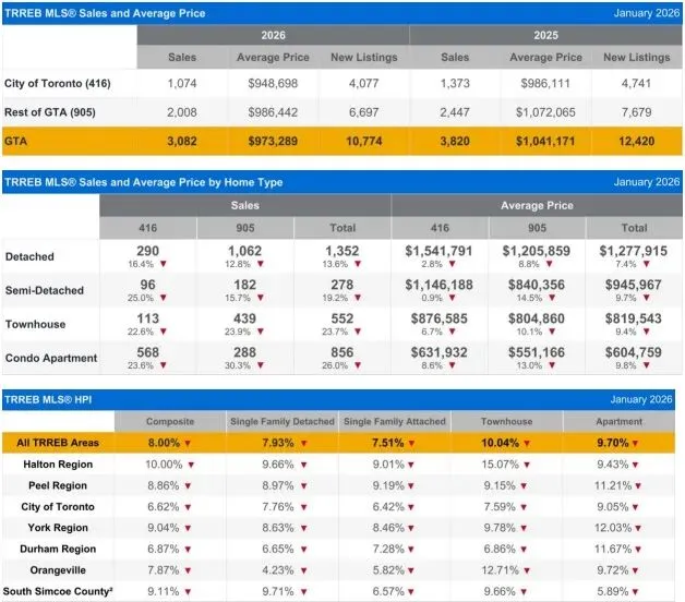 多伦多地区地产局(TRREB)今天公布的数据显示,今年1月区内房屋销售量为3082个单位,按年减少19.3%,远低于去年同期的3820个单位。