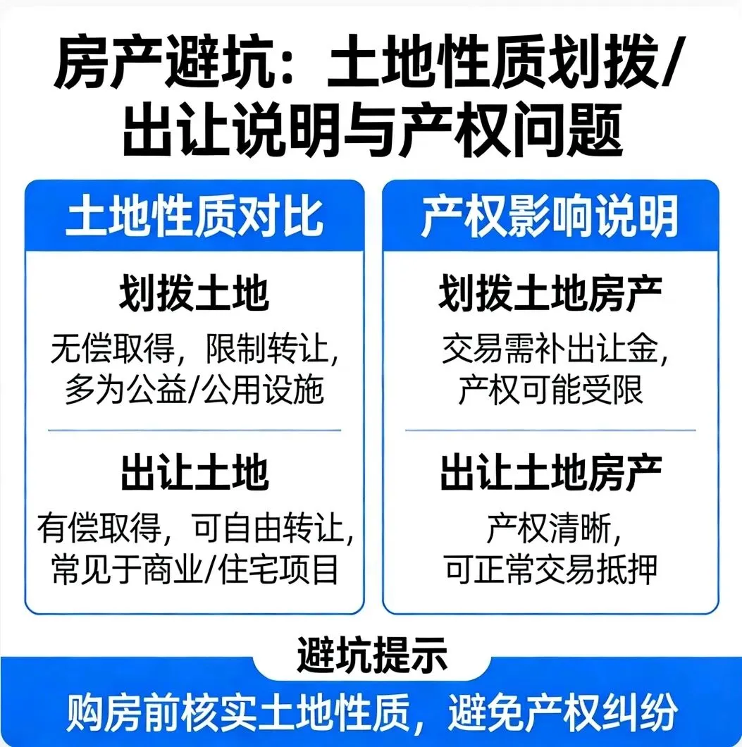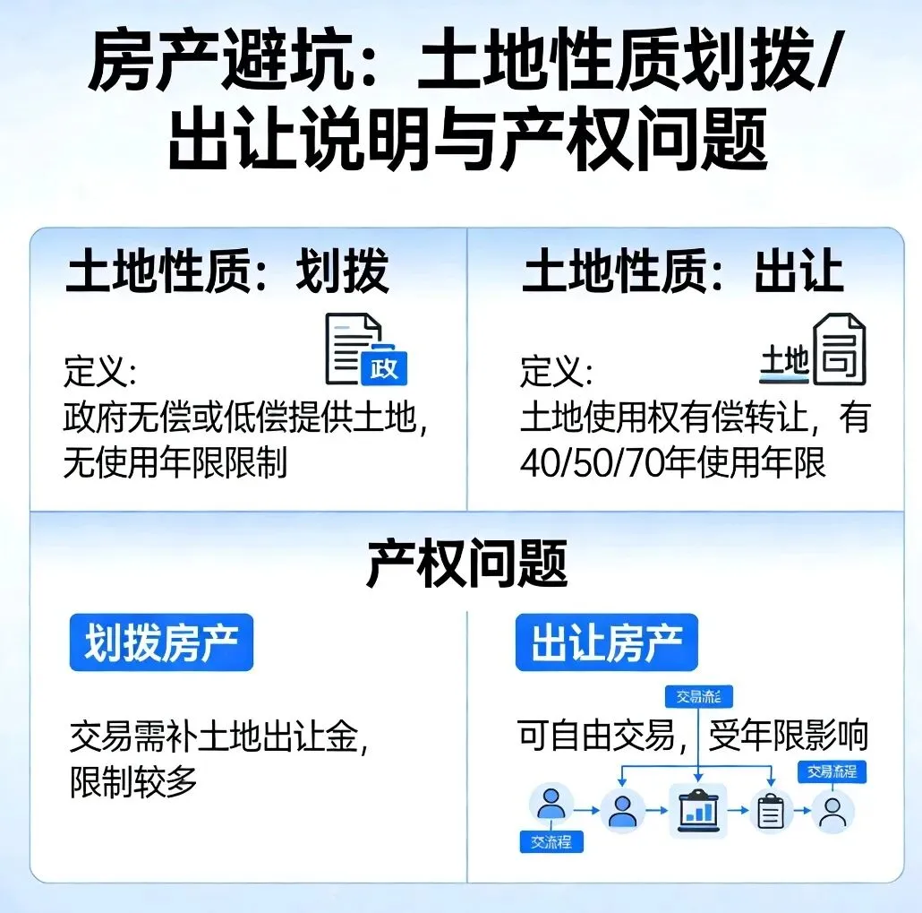 我们先说土地性质,它主要分为出让和划拨。之前有个朋友小王,看到朋友有一套房子价格比周边便宜不少,没多想就入手了。住了几年想换房时,才发现这房子土地是划拨性质。要卖房就得补缴一大笔土地出让金,这让小王后悔不已。出让土地是开发商花钱买的,购房者后续交易一般没啥大问题;而划拨土地多是政府无偿给特定单位或个人的,交易时限制多,费用也可能不少。