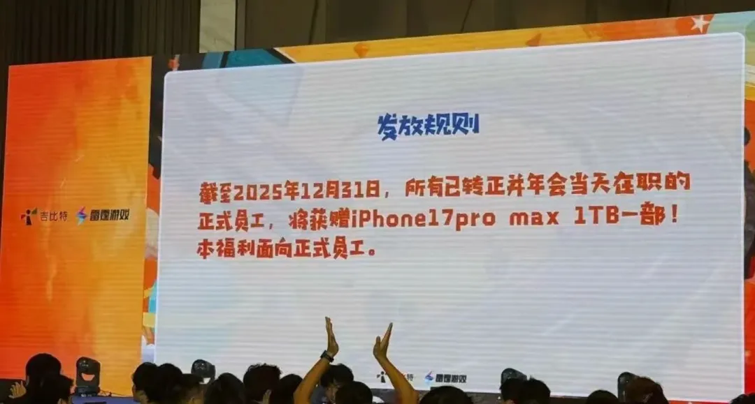 2026 年 2 月 3 日,吉比特 & 雷霆游戏年会的消息刷爆职场圈:全体在职正式员工每人一部 iPhone 17 Pro Max 1TB(官网价约 1.5 万元),爆款手游《杖剑传说》制作人直接获赠一套价值 1000 万的房产,项目组每人额外拿下 20 克定制黄金(按当前金价约 1.2 万元 / 份)。