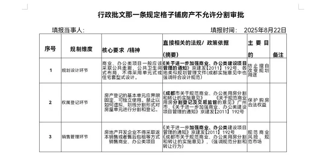 (1)土地与规划源头违法(根本问题)土地性质不符:土地出让合同中明确规定不得分割销售(如整体自持的商业用地),开发商擅自分割。规划许可不符:建设工程规划许可证上批准的用途是“商业整体”,“格子铺虚假房产”未经批准可分割为独立产权单元,开发商私自改变规划进行分割。