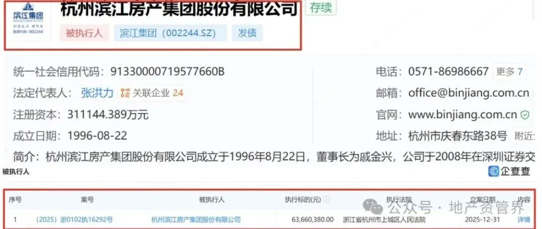 据悉,该公司因未履行法律文书确定的义务被法院强制执行,涉案金额6366.04万元,执行法院为杭州市上城区人民法院。这一事件发生在2025年12月31日,与其多家子公司(如南京滨鸿、杭州滨上等)同期成为被执行人形成连锁反应,累计执行金额超1.6亿元。