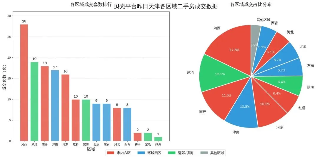 - 环城四区:津南(17套)领跑,西青/东丽/北辰均为8-9套,成交平稳,契合刚需外溢需求;
