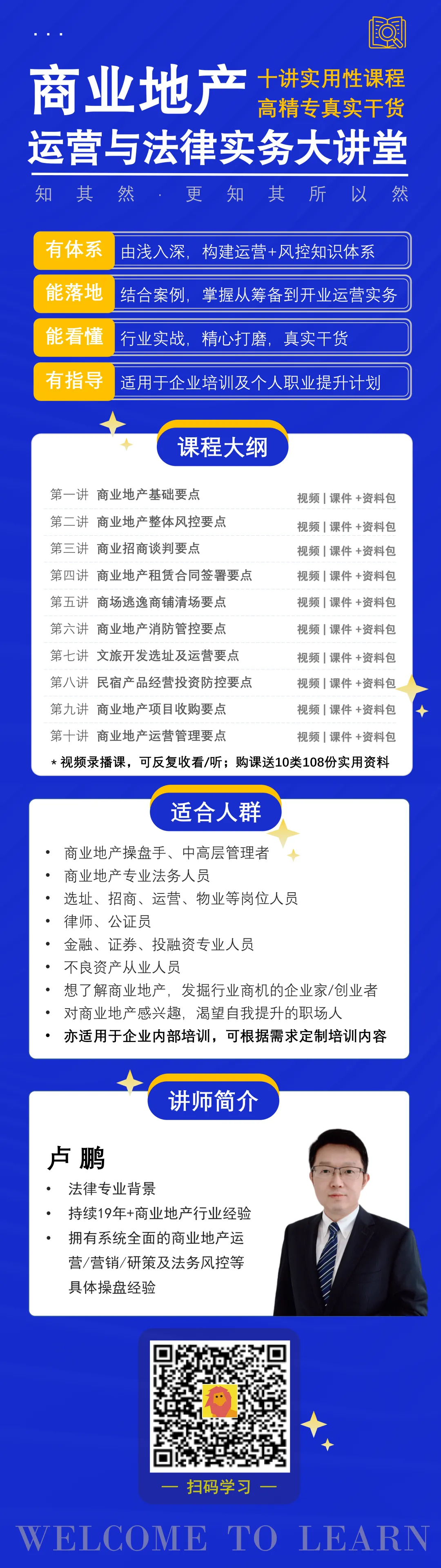 无论您是商业地产从业人员,亦或想了解商业地产、发掘市场商机的企业家、创业者,或者是对商业地产感兴趣、渴望自我提升的职场人,这都会是一次从入门到进阶的学习机会。都是实操得来的干货经验,建议有兴趣的你不要错过。希望通过对这次课程的升级,解决日常工作中常见疑虑难题。
