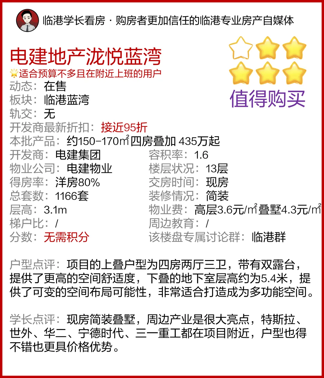 最新消息,临港蓝湾「电建地产泷悦蓝湾」正在热销中,推出建面约150-170㎡叠加,总价约435万起!