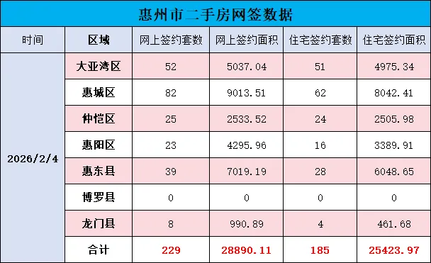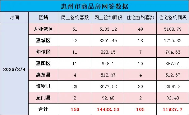 大亚湾区网签51套,面积5183.12㎡;惠城区42套,3201.49㎡;仲恺区11套,823.15㎡;惠阳区11套,948.1㎡;惠东县4套,512.67㎡;博罗县29套,3677.52㎡;龙门县2套,92.48㎡。合计150套,14438.53㎡。