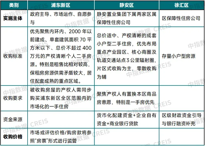 本次上海三个试点区域二手房收购的实施主体均为区属企业。收购房源聚焦小户型房源,如浦东新区明确优先内环内/2000年以前/70平以下/400万以内房源,静安区侧重交通便捷、居住配套成熟的二手房源。收购要求中,浦东新区明确要同步购买同区新房,静安区要求置换本区商品房,优先收购置换新房的房源。收购价格上,浦东新区明确根据市场或评估价开展。资金来源上,基本是财政资金、企业自有资金和银行贷款的组合方式。