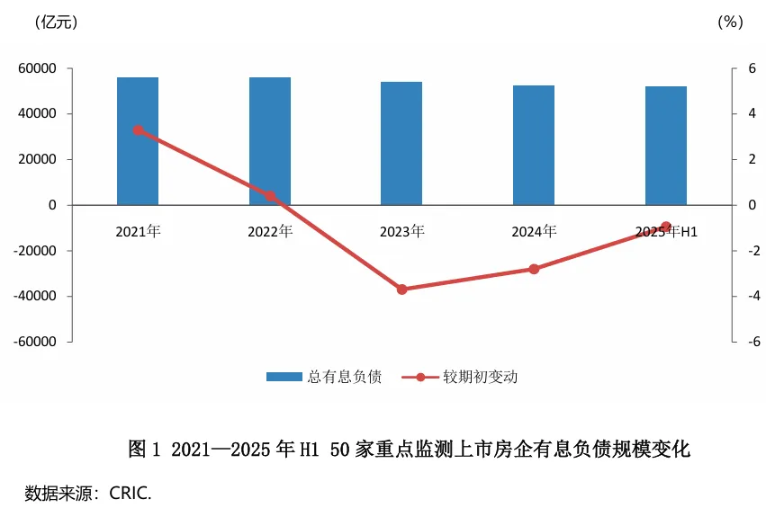 这一“紧箍咒”式的监管举措,直接改变了行业融资逻辑,倒逼房企开启全面降杠杆进程。据克而瑞统计数据,重点监测的50家上市房企的总有息负债规模自2022年之后逐年减少,2025年中期总有息债规模降至51816亿元(见图1)。与此同时,规模房企债务重组、重整等陆续落地,行业风险加速出清。截至2025年末,21家出险房企完成或获批债务重组、重整,累计化解债务规模达1.2万亿元,行业整体负债水平向健康区间靠拢。更重要的是,房企经营思路发生根本性转变,规模扩张不再是核心目标,财务稳健性、产品力与运营效率成为竞争关键,高杠杆发展模式彻底退潮。在此背景下,“三道红线”每月强制上报要求的取消,成为政策完成阶段性历史使命、有序退出的标志性事件。