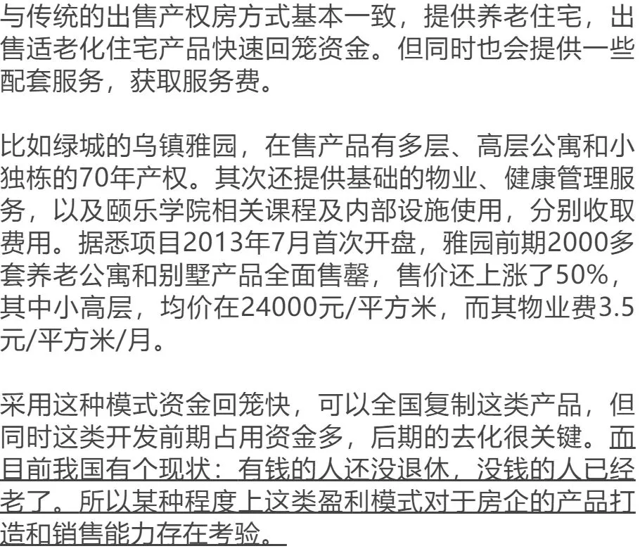 目前大多数养老项目的土地属于居住、商业、医疗用地,土地成本高昂;此外还要购买医疗、康复护理、娱乐等配套设施,前期资金投入量大,需要企业有雄厚的资金作为保障,千亿以上规模的房企可以大手笔布局,比如万科、恒大、保利等,产品线做得全,服务对象覆盖面大。很早尝试布局养老产业的万科,如今形成了随园、怡园、嘉园三条产品线,覆盖健康、半健康、失能老人,兼顾居家、社区、机构三类产品服务。