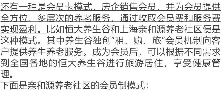 比如上文提到的恒大养生谷和哈佛布莱根医院合作建设的博鳌恒大国际医院,可供养生谷住户医治疑难杂症;保利旗下各“和熹会”项目与北大医院建立合作,北大医院将为和熹会项目提供医疗绿色通道合作单位,为“和熹长者”提供优先预约挂号、住院就诊服务、特需诊疗等服务,并为各“和熹会”项目提供医护技能培训及指导。