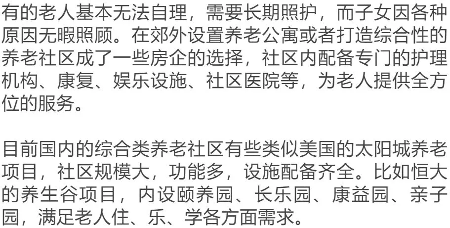以往老讲养儿防老,而不是养女防老,大抵是觉得儿子在身边,女儿嫁离家,透露养老的一个特征近身养老。但现如今子女多外出工作,即便离得近也无暇顾及。而地产行业的一些创新方式让老人能近身养老的近身,不能近身也能老有所养,养有所乐。