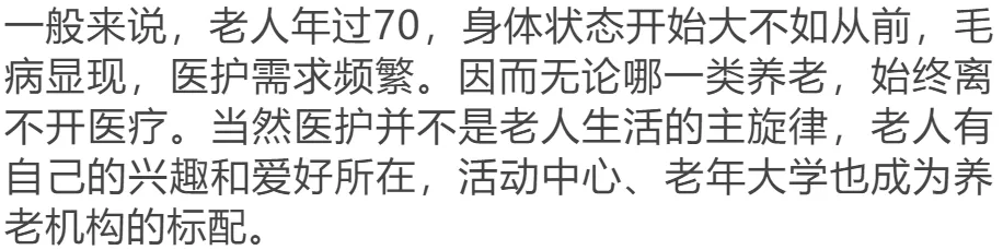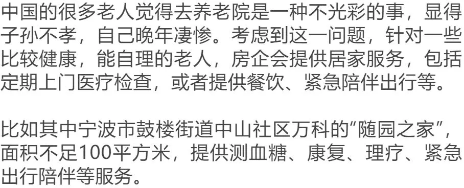 目前房企提供的养老方式主要有四种:机构、特色主题、居家、社区养老,而不是一刀切的进养机构。