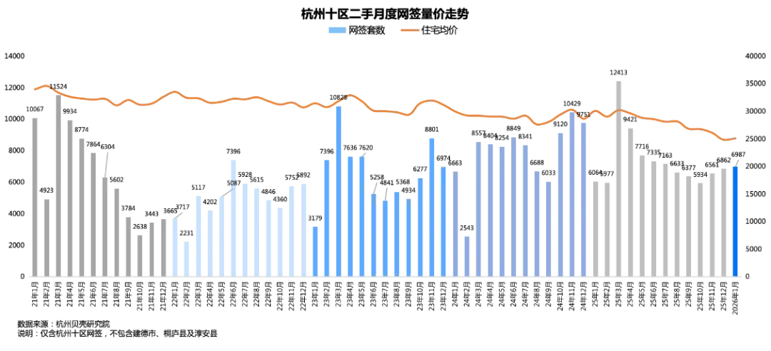 2026年1月,低总价的刚需二手房依旧是市场交易的主力军。杭州贝壳研究院显示,总价在200万元以下的住宅成交占比达到54.3%,环比去年12月下滑1个百分点,仍居于高位;总价300万元以内的房源成交占比达到75.5%,房源总占比超过了四分之三。