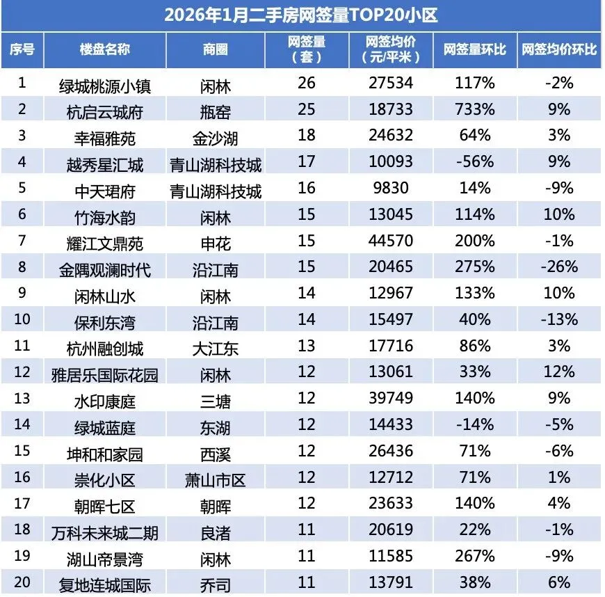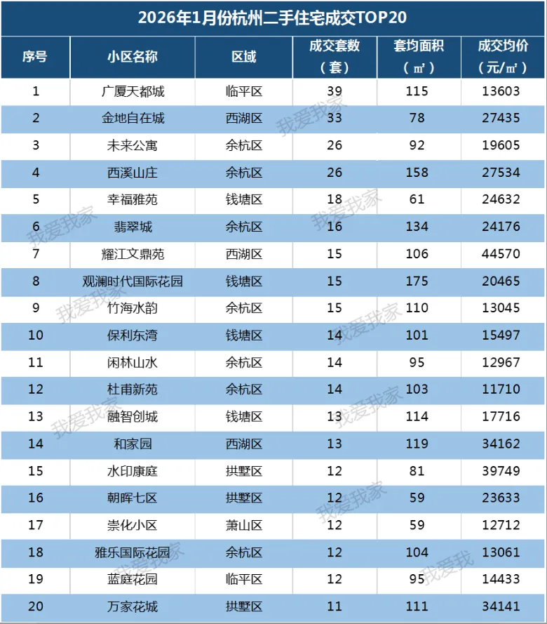 比如临平区的广厦天都城,依旧是成交第一的小区,1月共网签39套房源,套均面积为115㎡,成交均价为13603元/㎡。还有余杭区的竹海水韵、闲林山水分别成交了15套和14套,均价都在1.3万元/㎡左右。
