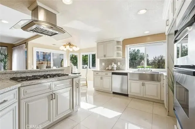 采用开放式格局设计,挑高拱形天花板,室内采光极佳,自然光充足。设有独立正式客厅与餐厅,温馨的家庭活动室紧邻高端美食厨房,厨房配备花岗岩台面、大量橱柜及不锈钢家电。