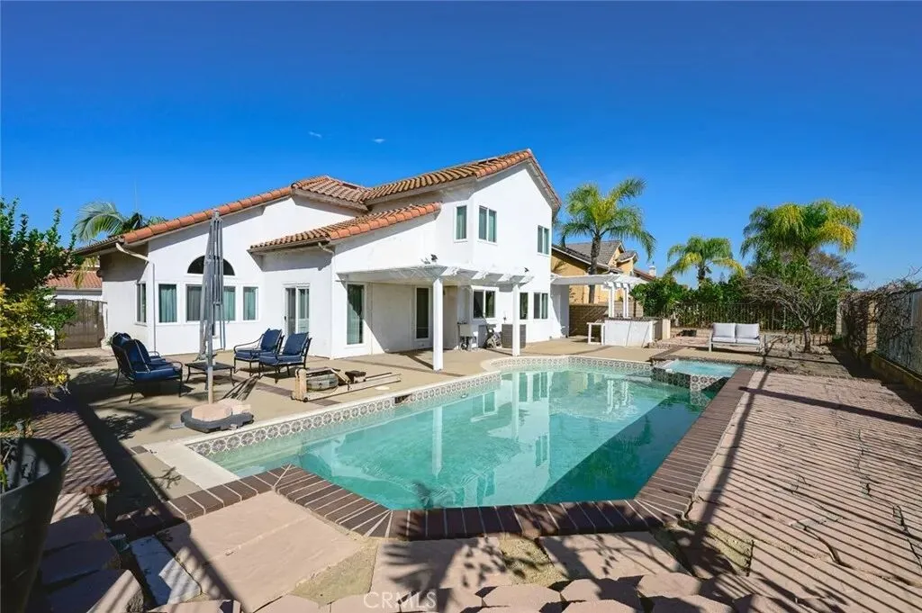 私密后院可欣赏壮丽的 Chino Hills 景观,配备大型泳池及内置烧烤炉,是休闲放松和招待宾客的理想空间。
