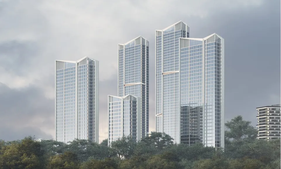 项目建筑立面以梦泽湖成群展翅飞翔的水鸟作为塔冠的设计参考,既体现当地特色,又增强设计整体性,简洁现代。外立面材质为高级灰玻璃+金属铝板,感观通透润泽。