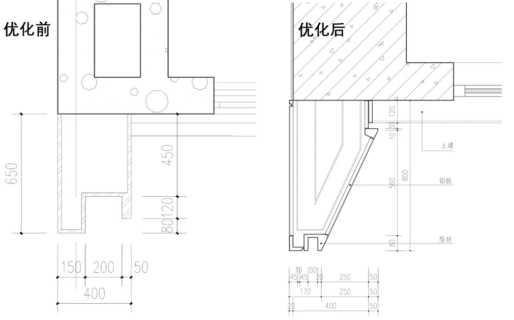 (1)北立面竖向次线条:前端展示面为铝板,内界面调整为斜切面,增加细节展示;后端非展示面为土建造型。