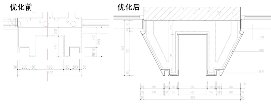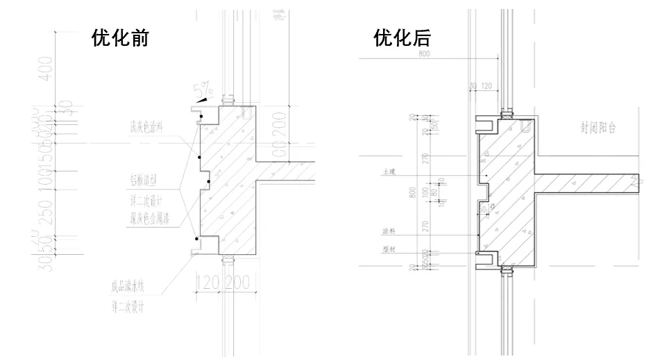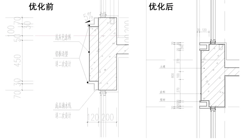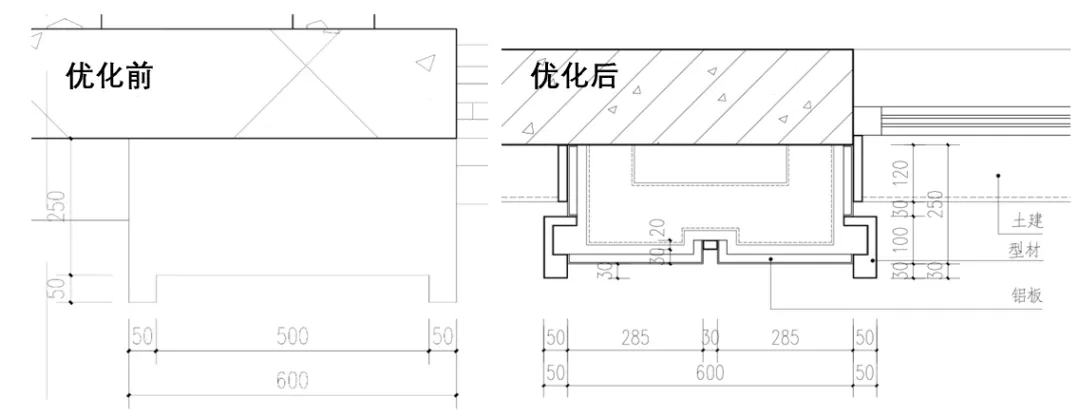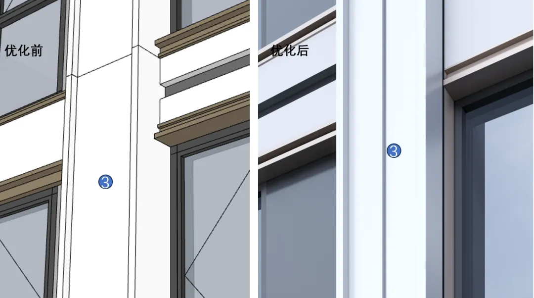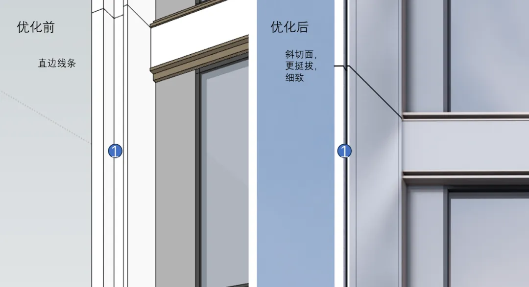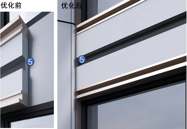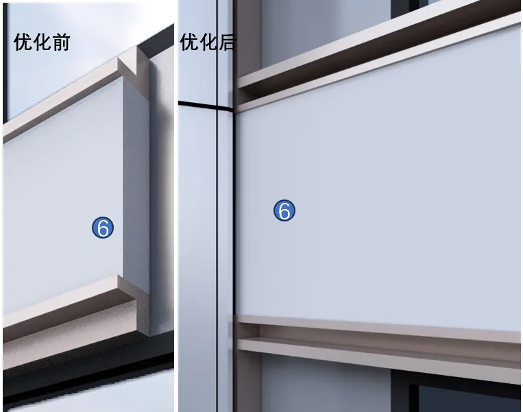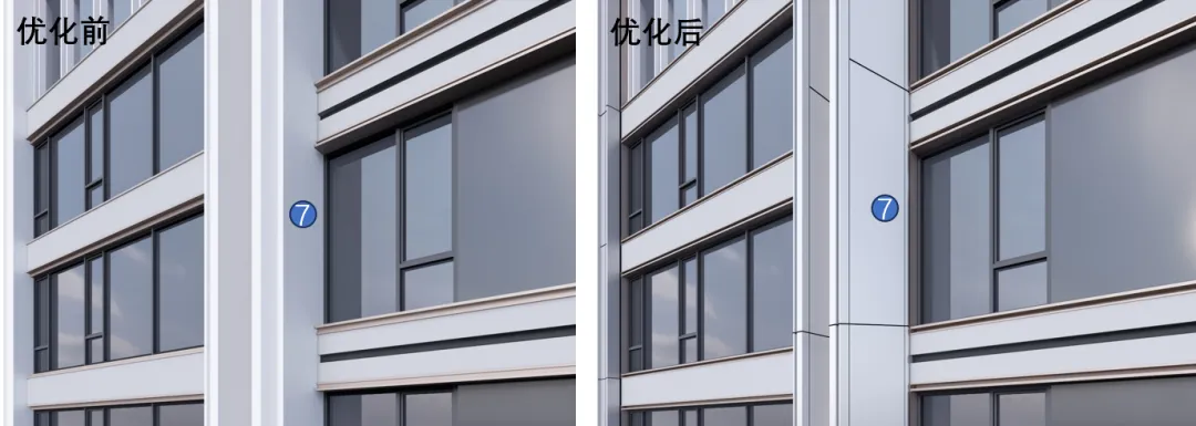 (3)南立面竖向次线条:增加中间凹槽,细节更丰富;小尺度构造采用型材控制,提升品质,减小施工难度。