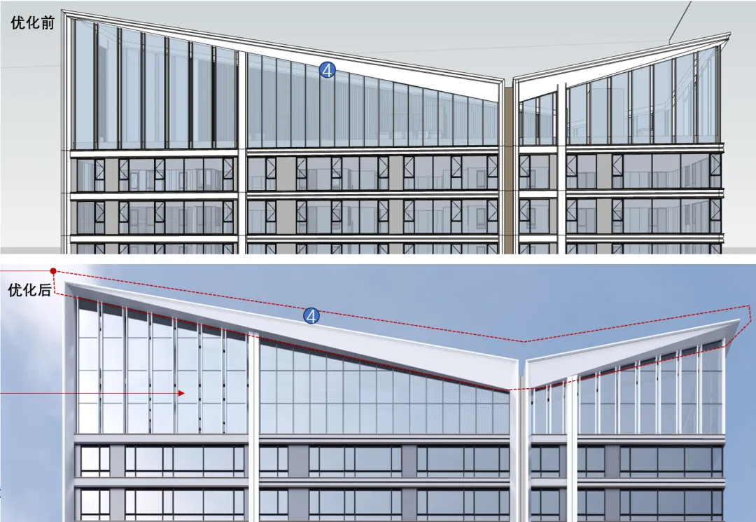 (1)南立面竖向外框大线条优化:界面内方向调整为外切斜面,减少视线遮挡;增加展示细节,设计更细致,提升品质;小尺度构造采用型材,更挺拔,减少铝板弯折,减小施工难度。