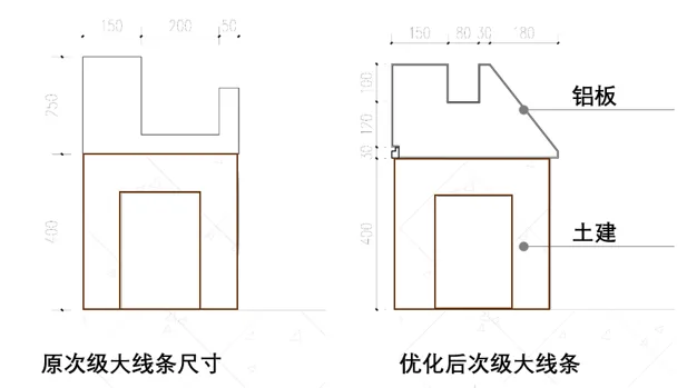 原方案采用铝板构造做出方形直边造型,对室内视线有一定遮挡,工艺要求高,竖向线条不够挺拔。