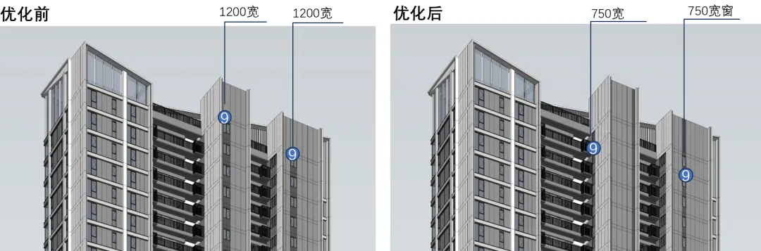 原方案采用铝板构造做出方形直边造型,对室内视线有一定遮挡,工艺要求高,竖向线条不够挺拔。楼梯间窗户为1.2米宽平开窗。