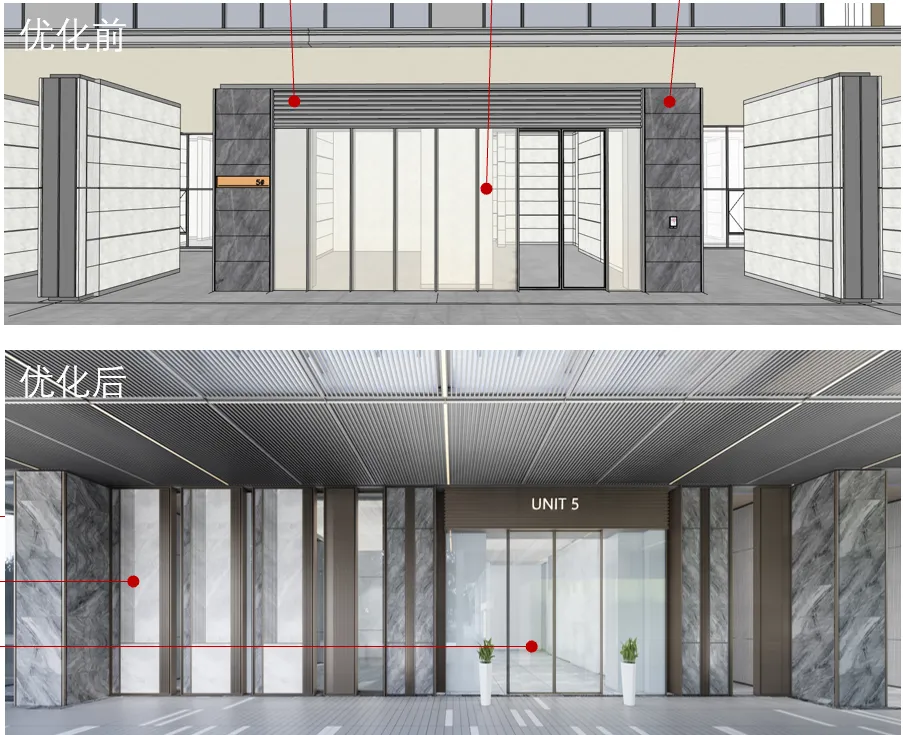 原方案单元大堂立面不完整,单元门未居中,玻璃幕墙分缝过于琐碎,业主“回家”仪式感不强。北入户单元大堂面宽较窄,相对南入户,均好性不足。楼栋号统一位于顶部,雨棚及风雨连廊对楼栋号形成遮挡,导致指示性不强。人脸识别外置,影响人行动线。