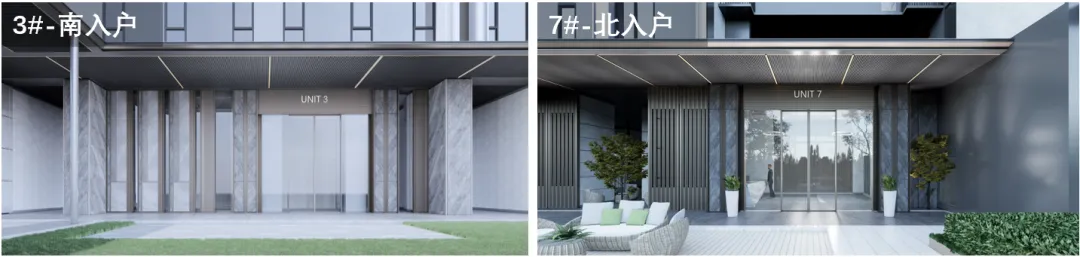 (1)单元入户大堂立面:增加了石材和铝板细节展示,大堂立面更完整。壁柱居于单元门两侧,单元门从内、外看均居中,业主“回家”仪式感更强。