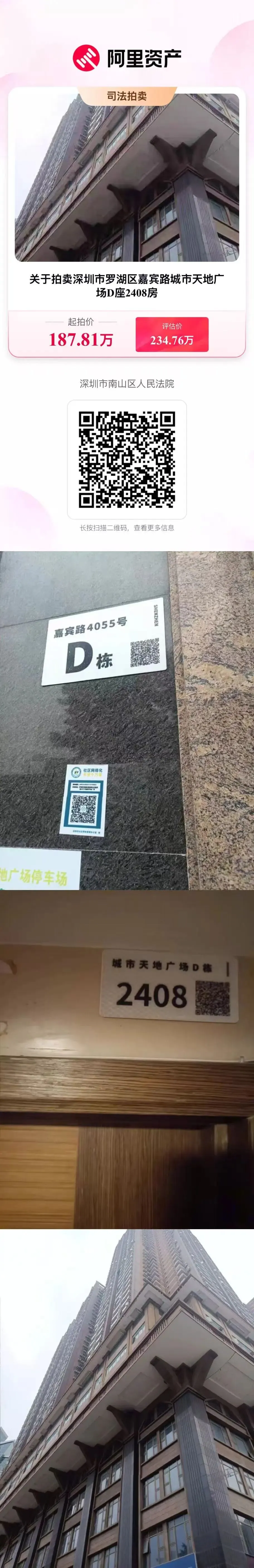 深圳市罗湖区城市天地广场房产将于2月25日进行一拍!面积57.17平方米,所在楼层24层,拍卖价格为评估价格7折,罗湖万象城商圈,步行十分钟可达1,2,9号线地铁站,小区生活配套齐全,周边教育医疗资源丰富。欢迎各位金主垂询参拍!成交后法院负责清场交付。
