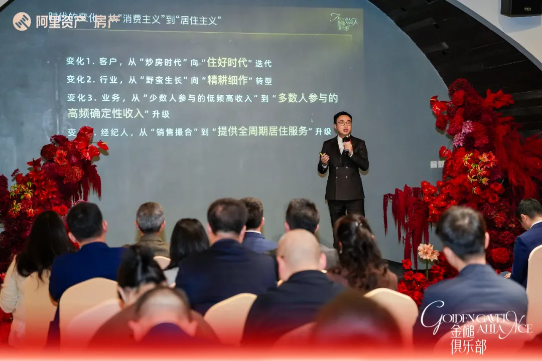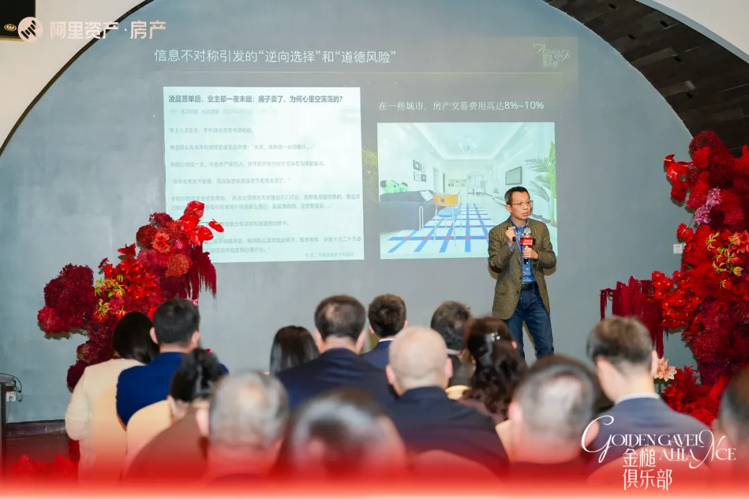 活动正式进入议程环节。阿里资产房产总经理井西超(井溪)首先致开场辞,他对各位行业同仁的到来表示热烈欢迎,并阐述了阿里资产房产在促进房产交易发展方面的思考与布局。他指出:“当前房地产市场正经历深刻重构,传统居间撮合模式已难以满足高效、透明、可信赖的交易需求。阿里资产房产以‘单边代理 × 线上竞价 × 蜂群联卖’为核心,致力于打造新一代房产交易基础设施,而‘金槌俱乐部’正是这一战略落地的关键载体”。