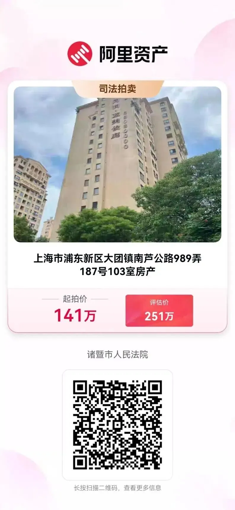 上海市浦东新区大团镇南芦公路989弄187号103室房产,建筑面积180.23平方米,用途为居住。