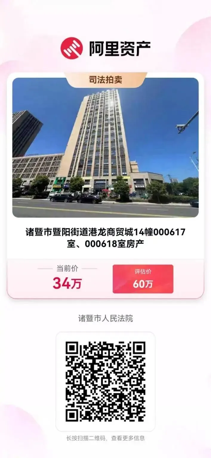 诸暨市暨阳街道港龙商贸城14幢000617室、000618室房产,建筑面积46.59平方米,用途为商业、商务用地/办公。