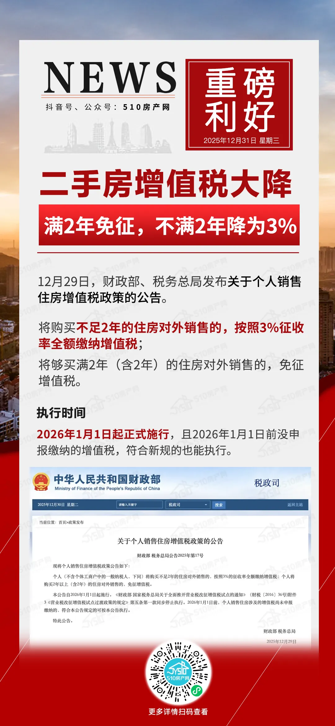 出售未满2年住宅,增值税及附加下降至3.18%,显著降低次新房交易成本,促进次新房流通,成为二手房市场交易的新热点。