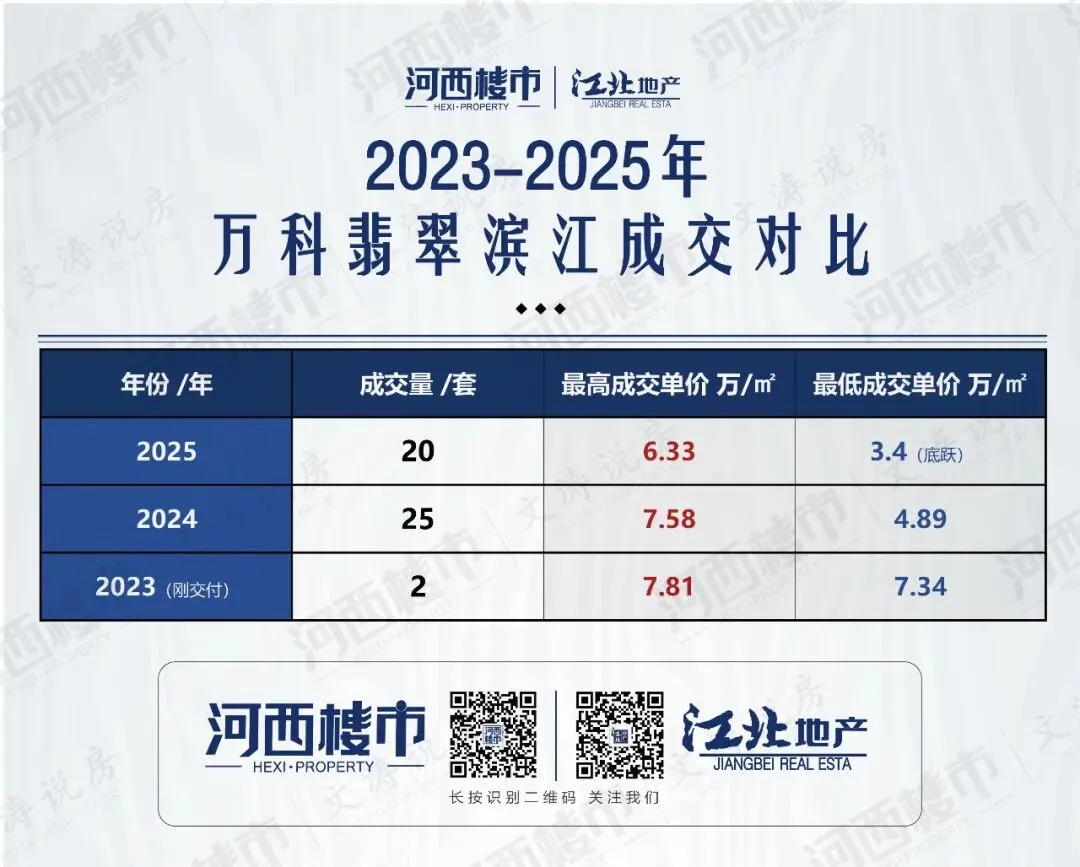 据不完全统计,万科翡翠滨江2023年-2025年三年的成交数据,共成交了47套。- 2025年全年共成交了20套,其中4月成交最多,共4套;