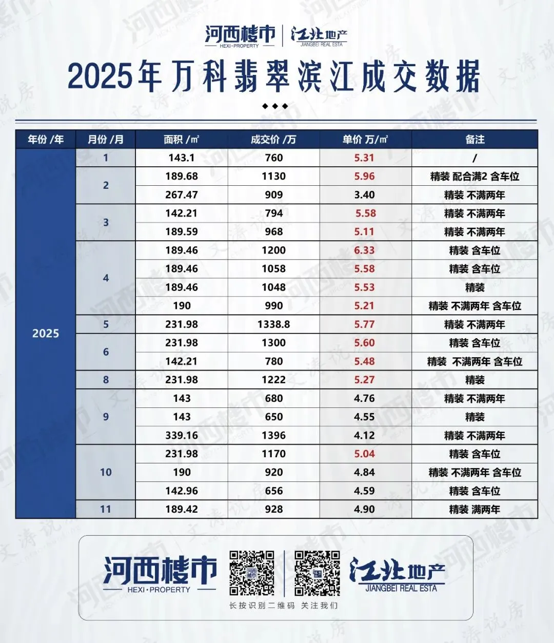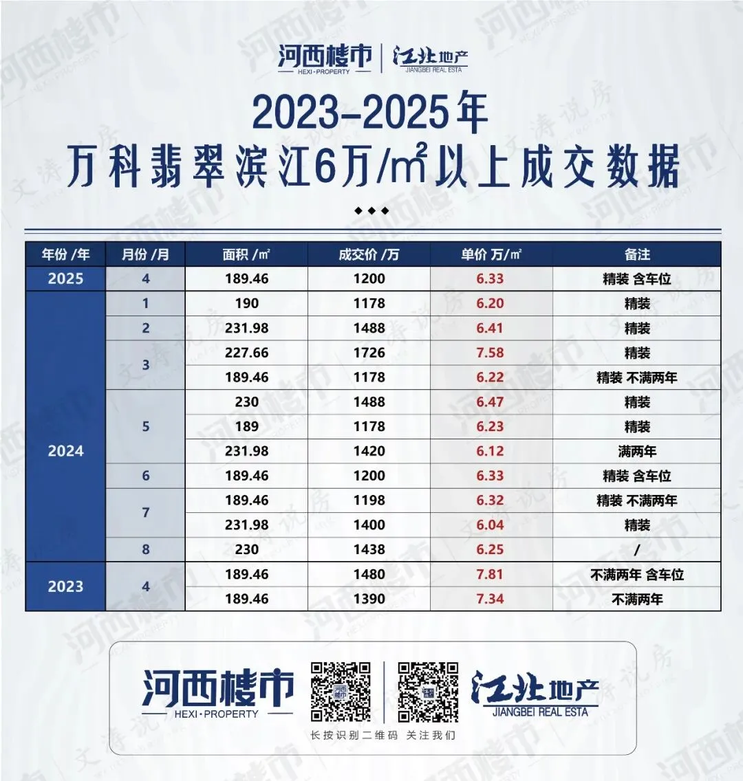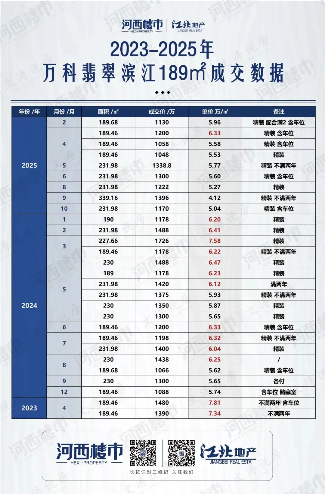 4、最高7.81万/㎡!14套成交单价在6万/㎡+——据不完全统计, 万科翡翠滨江成交单价在6万/㎡以上有14套,2024年成交最多,成交户型为189.46㎡、231.98㎡两个户型。- 2025年全年成交价在3.4-6.33万/㎡,1套成交单价在6万/㎡+;