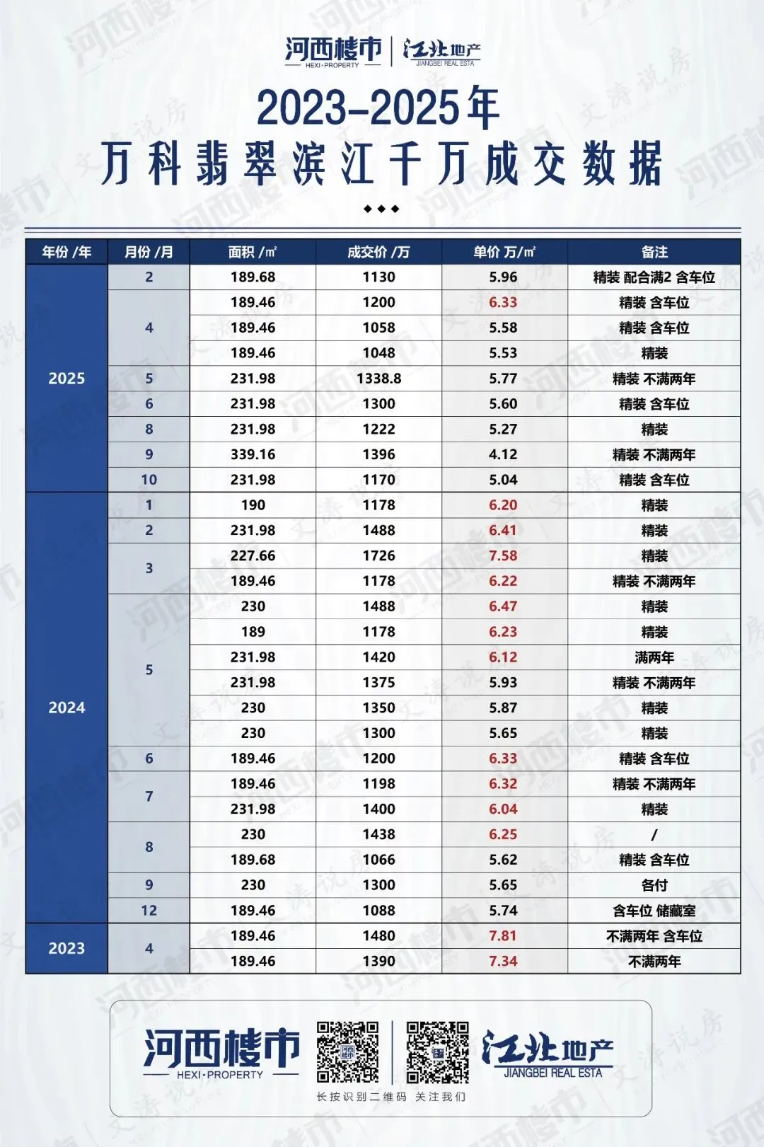 2025年1-12月:共成交20套房源,成交单价在3.4-6.33万/㎡,其中除了一套267.47㎡底跃外,成交单价均在5万/㎡以上,仅一套成交单价6万/㎡以上;2024年1-12月:共成交25套房源,成交单价在4.89-7.58万/㎡,其中有11套成交单价在6万/㎡以上,为6.04-7.58万/㎡之间,仅一套成交单价7万/㎡以上;2024年也是万科翡翠滨江成交价的顶峰之年,成交的25套房源中有24套单价在5万/㎡以上,占比96%。2023年1-12月:共成交2套房源,成交单价在7.34-7.81万/㎡,其中2套成交单价均在7万/㎡以上。据不完全统计,2023-2025年万科翡翠滨江共有28套成交总价在千万以上房源;最高成交总价为2024年5月成交的一套230㎡大平层户型,单价6.47万/㎡,总价1488万。- 2025年全年,共成交了9套,成交户型为189.46-339.16㎡;