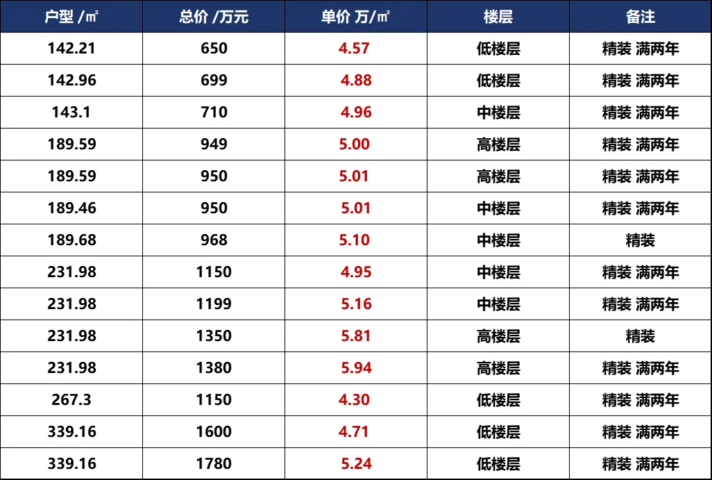 1、2025年1-12月共成交20套房源:成交户型为142.21-339.16㎡,单价在3.4-6.33万/㎡之间,总价650-1396万;