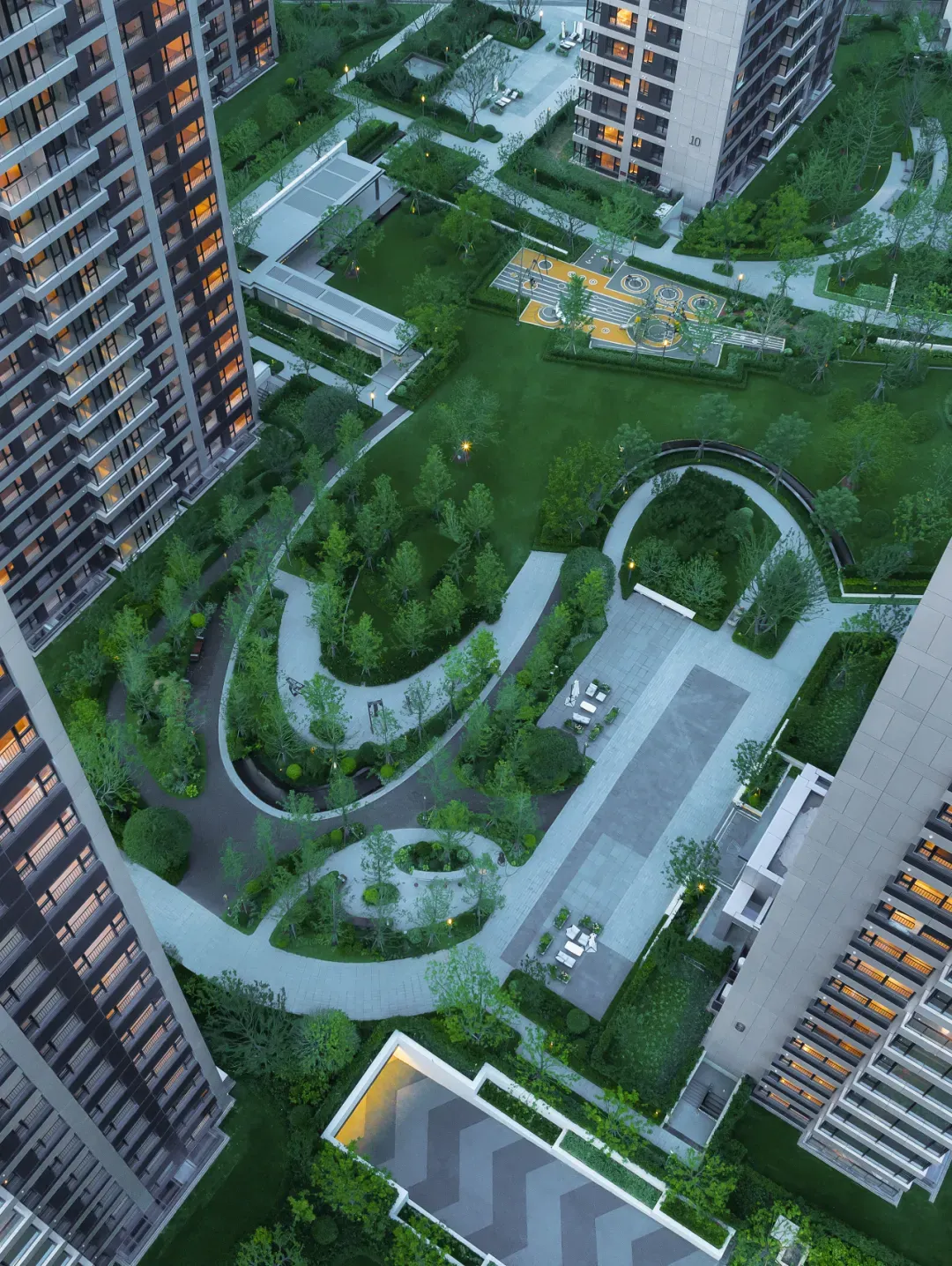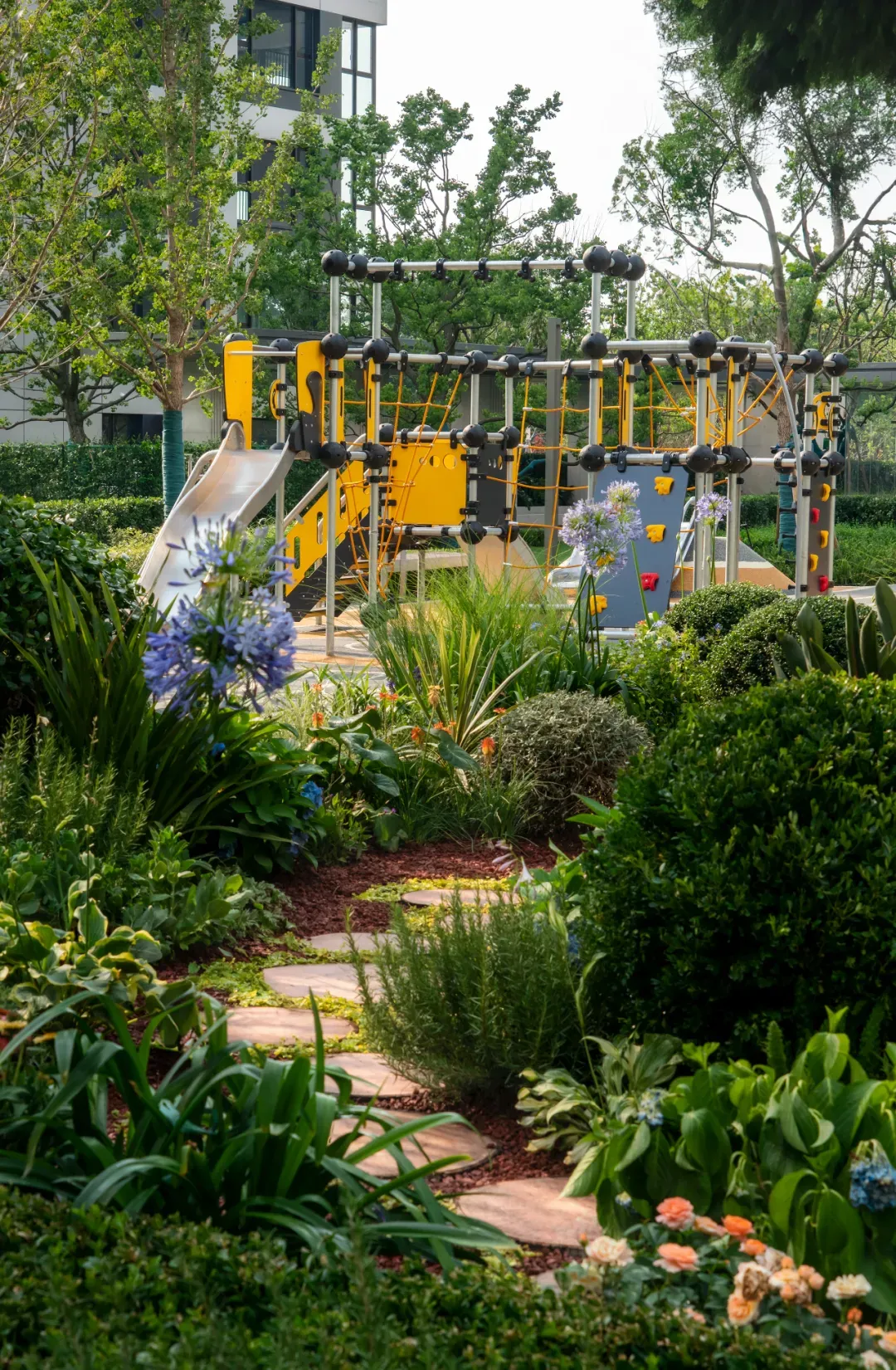 园区景观,多样化的几何线条与水景、绿植、灯光融为一体、相得益彰,呈现别样的趣味与美感。↓↓小区内部儿童游乐区。↓↓